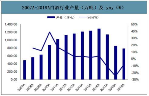 2007A-2019A白酒行业产量(万吨)及yoy(%)