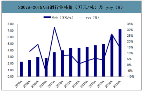 2007A-2019A白酒行业吨价(万元/吨)及yoy(%)